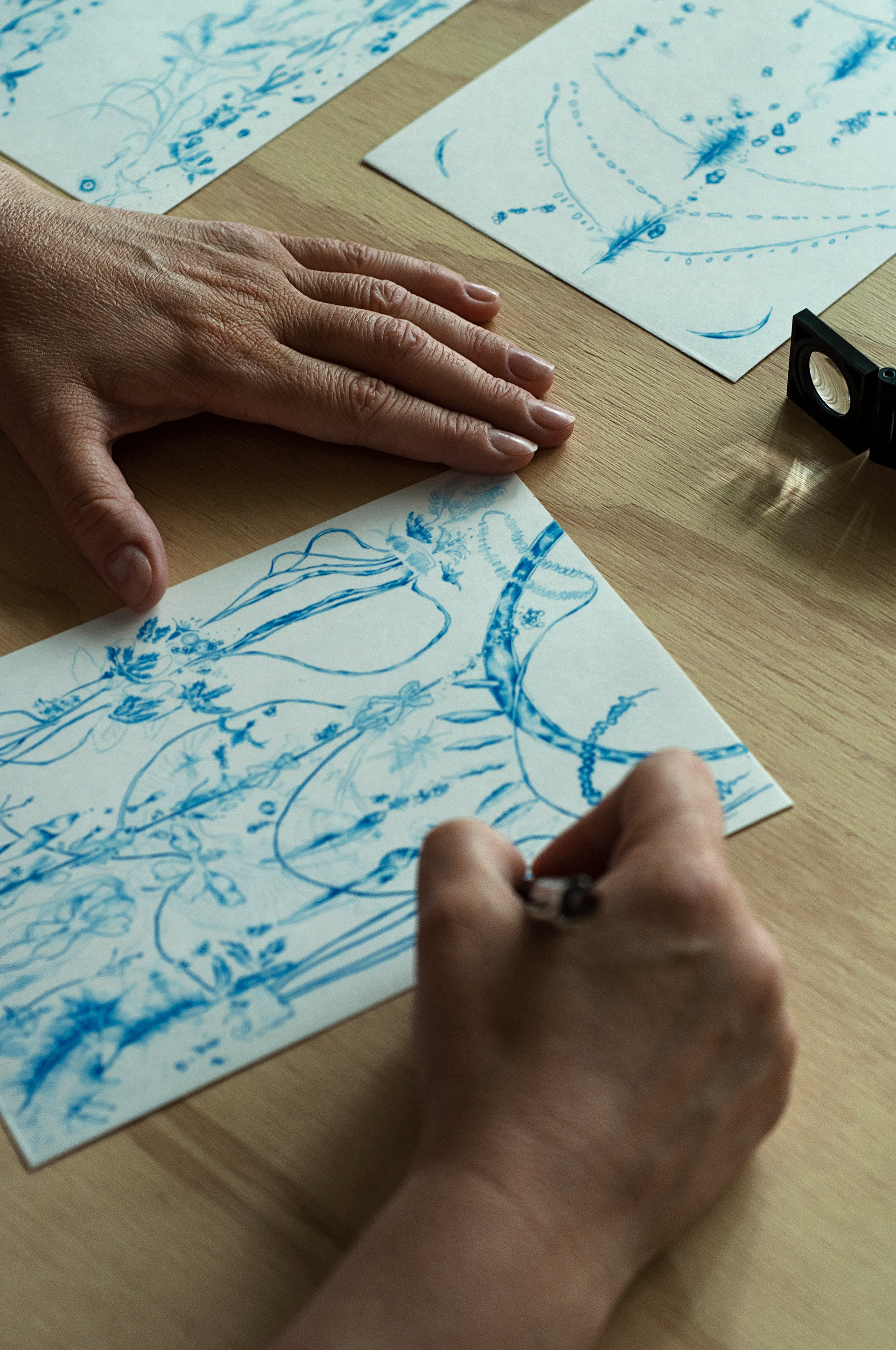 Pepa Mora es una artista, profesora e investigadora en Granada, donde enseña en la Universidad de Granada y se licenció en Bellas Artes. Su obra explora el dibujo como medio para conectar con el subconsciente, creando formas intuitivas y espontáneas que capturan lo efímero. En su serie "El ombligo de Venus", aborda temas de supervivencia y resistencia a través de trazos sencillos, generando una atmósfera meditativa. Inspirada en el arte bruto, su estilo es espontáneo y sutil, invitando a la reflexión personal y la exploración de la conciencia.